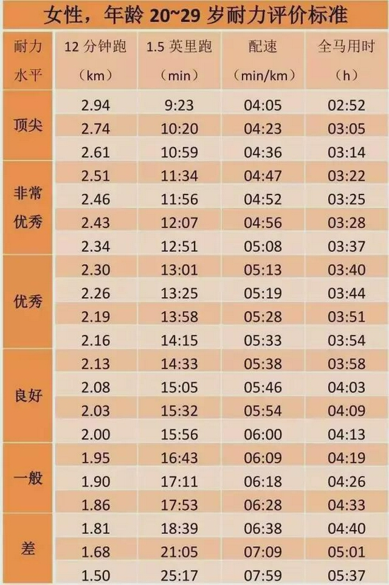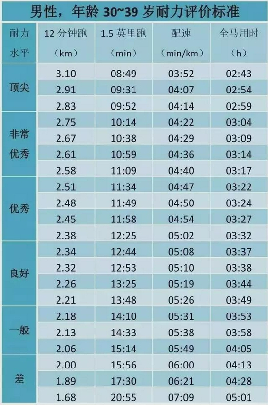 基于这一点全球最专业权威的、有氧运动之父——美国军医库伯提出了一套国际标准耐力评价表:12分钟跑步配速测试。