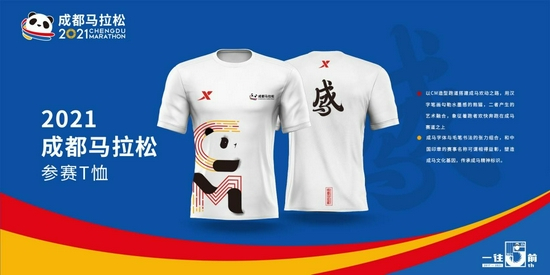 本届赛事参赛服前胸设计以‘CM’造型跑道搭建成马欢动之路,用汉字笔画勾勒水墨感对熊猫,二者产生的艺术融合,象征着跑者欢快奔跑在成马赛道之上;服装后背‘成马’字体与毛笔书法的张力组合,和中国印章的赛事名称可谓相得益彰,塑造成马文化基因,传承成马精神标识。