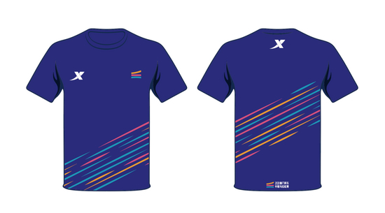 2021厦门环东半马参赛服采用T恤款式,男女同款,以‘环东蓝’为底色,前后辅以“三色流星彩条”印花。服装面料采用最新型网碟布面料,轻薄透气、柔软亲肤,给装备“减负”的同时,细密的网碟孔还具有极强的吸湿排汗速干功能。