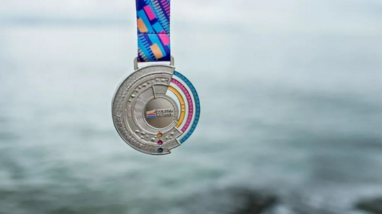 ‘半程马拉松项目完赛奖牌’呈现潮汐公园退潮时的完整形状,同时巧妙嵌入代表‘时、分、秒’的三色拨盘,通过转动拨盘,可在奖牌上记录跑者的完赛成绩。