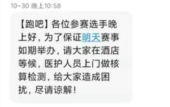 据说,组委会为了确保赛事如期开跑做了大量的准备工作,所有参赛选手在领物时均需提供行程码、健康码信息。就在昨天晚上11点,赛事方还在发短信给选手,对参赛的选手进行赛前的核酸检测工作,这样确保赛事的安全举办。