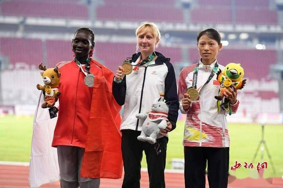 资料图:2018年8月25日,雅加达亚运会田径女子10000米决赛结束。中国选手张德顺以32分12秒78的成绩获得季军,并打破了个人最好成绩。图为张德顺登上领奖台。 中新社记者 杨华峰 摄