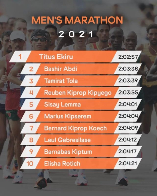位列第一的是肯尼亚的Titus Ekiru,在2021年的意大利米兰马拉松上,他跑出了2:02:57的成绩,这是2021年最快的马拉松成绩。