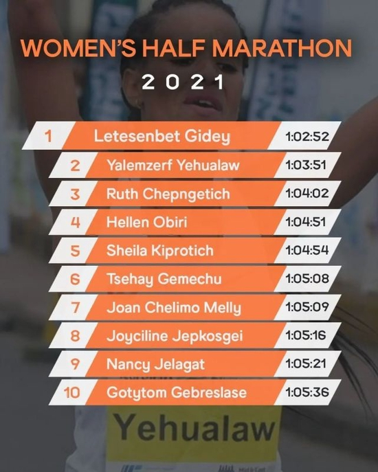 女子半程马拉松是2021年世界纪录被打破次数最多的路跑项目,第一名是埃塞俄比亚的Letesenbet Gidey, 在2021年的西班牙瓦伦西亚马拉松上夺得女子半程冠军,成绩是1小时02分52秒,这成绩也是现在混合女子半马的世界纪录。