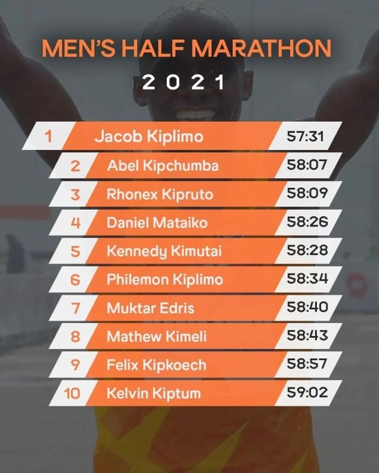 第一名当仁不让的是乌干达的Jacob Kiplimo,在葡萄牙里斯本马拉松上57分31秒夺得半程马拉松冠军,并且打破半程马拉松纪录。