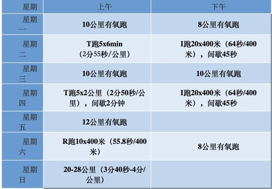 2是指每周要安排一次有强度的训练课和一次力量训练课,有强度的训练课可以安排马拉松配速跑、乳酸阈跑或者间歇跑,力量训练课则至少需要持续一小时,将上肢、躯干和下肢都进行训练。