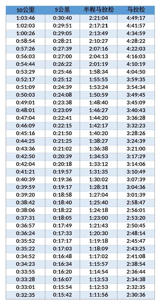 下面来自丹尼尔斯训练法中10/5公里与半马以及全马的理论对应关系。