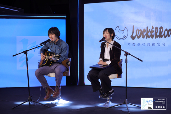 在该环节中,ECO氪体播客节目《洛克屋中场秀》的两位主创JOJO和熊花,也来到了年会现场,以《2021,洛克屋的‘体育大年’》为题,讲述了播客背后的体育生活故事。而在演讲最后,他们也以不插电的方式,演唱了洛克屋组合的原创歌曲《不要伤心我的宝贝》。
