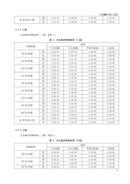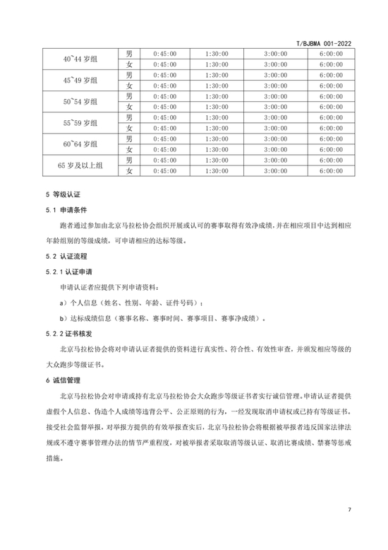 相较于田协的等级评定,北京马拉松协会的评定标准更为细化,等级划分从高到低分为健将级、一级、二级、三级、四级、五级、六级这7个标准。项目设置则包括马拉松、半马、10公里和5公里4个项目。