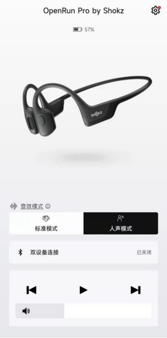 在OpenRun Pro问世之际,韶音也顺势推出了专属的APP,进一步方便了耳机的使用。通过APP,你可以查看电池的电量,控制音量以及切花歌曲等操作,此外,还能够切换耳机的模式,目前有标准模式和人声模式,标准模式就是日常听歌时使用,人声模式主要是强化了中频使用,更适合于听电子书。