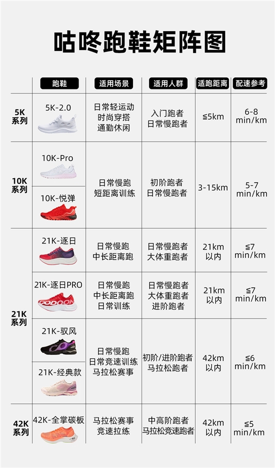 作为最懂跑友的专业国民运动品牌,咕咚经过十余年深耕,始终坚持将科技优势转化为创新动力,并已成功推出一系列堪比国际大牌的“明星跑鞋”。根据不同的运动场景、跑步里程,咕咚划分出四大智能跑鞋矩阵,即5K(日常运动)、10K(短距离运动训练)、21K(日常综训)、42K(专业竞速),满足从初阶到高阶不同人群的需求。而咕咚厚底逐日PRO的加入,更进一步覆盖进阶跑者、大体重跑者等群体对“跑步更轻快”的渴望,为他们提供了慢跑、日常训练的新选择。同时,也进一步夯实了咕咚专业数字化运动装备品牌的根基,为其打造更多颠覆跑者想象的国民跑鞋带来更多可能。
