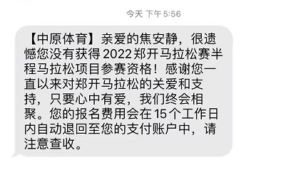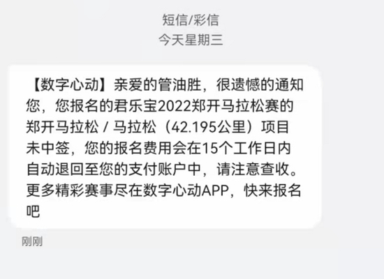 郑开马拉松公布抽签后,管油胜晒出了自己的短信截图,表示自己报的全马项目,没有中签。很多没中签的跑者表示心理平衡了,大神都没有中签,自己也不遗憾了。随后管油胜也表示,抽签就是这样,大家的概率是一样的,体现了公平性,大家不必起哄,自己有直通的资格。