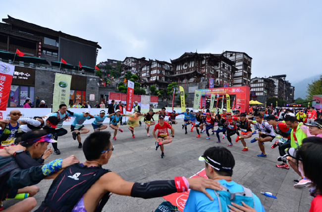 参赛选手们赛前在专业运动员带领下集体热身(本文配图均选自2019年中国赤水河谷超级长跑黄金大奖赛)。