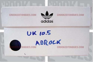 既然表明此双Superstar为义卖之鞋,鞋身处自然要有三位团员的亲笔签名,因此大家可以在左鞋的鞋侧处发现Mike D的签名、右鞋的鞋侧处则有MCA和Ad-Rock的签名,至于鞋后侧处就有写上的‘Beastie Boys’ 2005的字样,就连鞋盒上也由Ad-Rock亲自写上UK 10.5D尺寸。