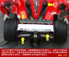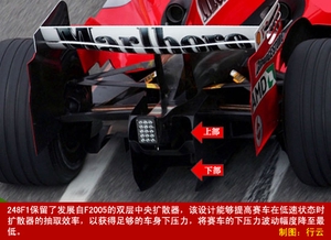 248F1保留了发展自F2005的双层中央扩散器,具体方案是用一块向前倾斜的翼片,将中央扩散器分为上下两部分。据法拉利称,这样做的好处是,能够提高赛车在低速状态时,扩散器的抽取效率,以获得足够的下压力,将赛车的下压力波动幅度降至最低。