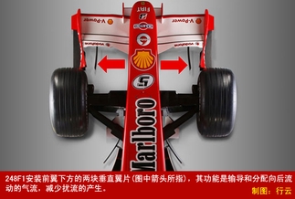虽然248F1的前翼照搬了旧车型(首站比赛前更新),但是仍然值得关注,特别是安装前翼下方的两块垂直翼片,他们的功能是输导和分配向后流动的气流比例,减少扰流的产生。如果要细分,经过前翼下方的气流可分为七部分:端板外侧(2)、端板与垂直翼片间(2),垂直翼片与唇翼间(2)和唇翼(1)。