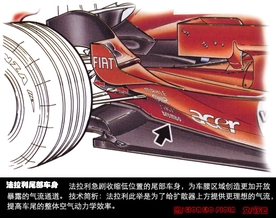 技术分析:由于法拉利增加了侧箱导流板的底板面积,因此这个涡轮生成设计则用于提取净化底板下方的气流。
