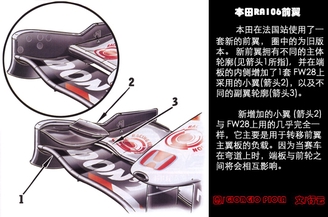 本田在法国站使用了一套新的前翼,圈中的为旧版本。新前翼拥有不同的主体轮廓(见箭头1所指),并在端板的内侧增加了一套FW28上采用的小翼(箭头2),以及不同的副翼轮廓(箭头3)。