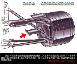 法拉利在法国站使用改进的制动包覆鼓,其主要特点是在其上加装了了非常明显的下压力制造装置(见红色箭头所指),位于上叉臂上方的一块,在去年的车型上便开始使用。