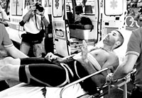 组委会立即将救护车开到场内,简单处理后将伤者送往医院。而此时,制造了“流血事件”的皮特卡马基一脸痛苦表情,双手抱头,似乎难以相信眼前的一切。此后的比赛中,皮特卡马基无心恋战,但凭借此前的成绩还是得到了一枚银牌,而这也宣告了他由此退出争夺百万奖金的行列。跳远赛场的选手同样深受影响,美国名将德怀特·菲里普斯在意外发生时正好在伤者旁边,他随后的第4跳过线一大步,形同放弃。