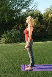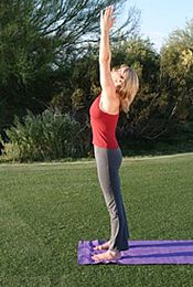 ▲ 吸气,直立,双臂伸展,高过头顶。呼气,将双臂收回体侧。