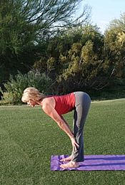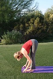 ▲ 吸气,双脚站于瑜伽垫前端,上身与腿部折叠,十指舒张,指尖触地。