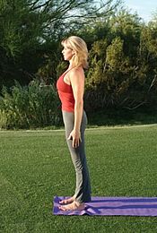 ▲ 站立,双腿直立,双脚略微分开,两脚距离约等于肩宽,从足弓处抬起上提身体,仿佛你粘牢在地面上一样。吸气,将双臂高举过头顶。