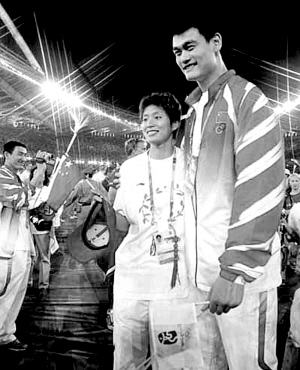 2004年雅典奥运会闭幕式,他俩手牵手的镜头出现在电视屏幕上,这段恋情终于浮上水面。值得一提的是,在国家队出征雅典之前,篮协安排男女篮拍集体照,姚明开心地拉过叶莉,两人搬了椅子坐在国家队训练馆的篮球场上,留下了一张合影。