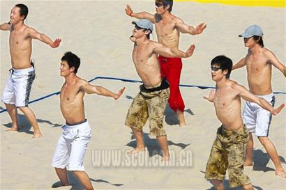 根据沙滩男孩的领队高信东介绍,沙滩男孩是本次测试赛的一个创举,因为在世界大赛中通常是由女性担任沙排宝贝。“用小伙子来承担表演任务,我们应该是独一份。”