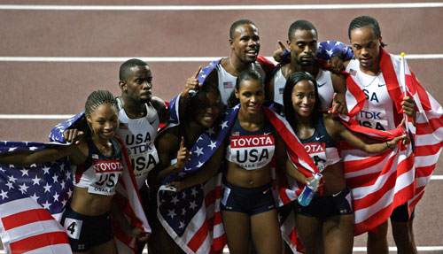 霸气使然!世锦赛倒数第二天的焦点之战莫过于男女4x100米接力的决赛,最终,美国男女竭力队在两场绝对速度的较量中分别笑到了最后,双双加冕世锦赛冠军,延续了他们在以上两个项目上的优势。赛后,菲利克斯(女)、迪克逊、劳琳-威廉姆斯(女)、托里-爱德华兹(女)、帕顿、巴贝尔(女)、盖伊和斯佩尔蒙八人在媒体的闪光灯前举起了象征胜利的手势,纯正的美国式微笑背后确实一种令人难以企及的霸气。