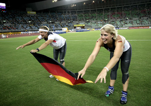 进球庆祝!在女子标枪的决赛中,两位德国女将奥贝福尔和内里乌斯尽管协同作战,去仍未将最终的冠军划入德国代表团名下。但是一银一铜的成绩也足够让两人欣喜,这不,比赛结束之后,两人分别牵起德国国旗的一角,准备用德国人更为熟悉的进球庆祝动作表达夺牌宣言,并顺势投入到那一席碧草的怀抱之中。