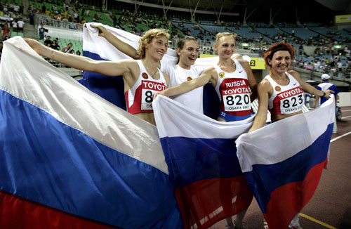 双倍成色!世锦赛女子跳远的前三名全部被俄罗斯娇娃们夺得,依旧显示出了她们在田赛中的霸者地位,而夺冠之后,三位娇娃恐怕是嫌冠亚季军的成色仍显不足,邀来了获得女子撑杆挑冠军的伊辛巴耶娃一起来庆祝,四面俄罗斯国旗颇有层次感的组成了红蓝白的海洋,无形中却形成了双倍的成色。
