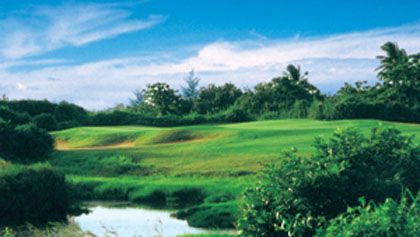 在这设有 18 洞, 72 杆,全长 7019 码的球道上,前 9 洞绕岛环走,周围环江绕海,四面碧水泛波,融海天风光和远山近水于一体。后 9 洞岛中穿行,集沙池奇石、椰林苇荡、田园景色于一身,即使是盛夏也是凉风随身,侯鸟伴行,俨然一座既过球瘾又有野趣的自然公园。