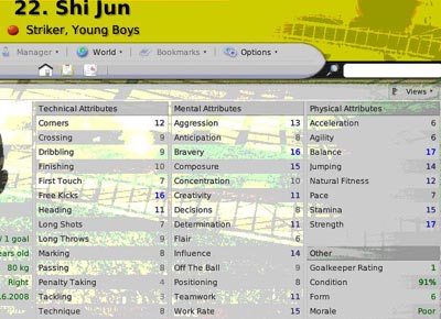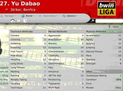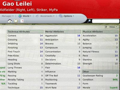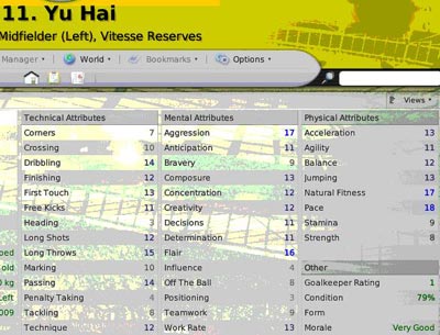FM系列游戏之FM2008在下半年已经宣告出品,熟悉这款游戏的玩家都知道,这部游戏最为人认可的地方就是他的真实性,尤其是对于球员能力的统计,许多现在的明星球员在几年之前就已经在FM系列游戏中成为“妖人”,因此甚至有许多球队在引援时会参考FM系列游戏的球员数据。而我们也找到了目前9名效力于海外球队的中国球员的数据进行汇总,虽然并不能做到绝对准确,但是对于认知他们在国外联赛中的真实地位和水平还是有一定的帮助。