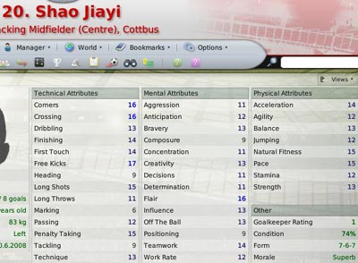 远在科特布斯的邵佳一究竟实力如何?在德甲应该属于什么档次的球员?fm给了我们一个有些意外的答案,尽管在科特布斯也仅仅是超级替补球员,但邵佳一的各项数值并不输给郑智,从技术数据上看,角球(16)、传中(16)、任意球(17)、远射(15)、一脚触球(14)和点球(15)都是邵佳一的强项,符合他的特点,精神方面才华(16)和创造力(13)诠释了一名合格的进攻核心,而身体方面邵佳一没有弱项,速度(15)和体质(15)都相当不错。说他是科特布斯进攻能力最具特色的人毫不为过,实际上,这样的数据保证了他到德甲的任何一直非豪门球队都有争夺主力位置的能力。