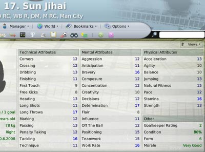 尽管已经效力曼城6个年头,尽管已经年近30,尽管现在在球队中寻找主力位置面临着极大的难度,但是看看孙继海的数据,在英超作为主力替补球员还是绰绰有余,体能(16)、身体素质(15)和后卫必要的抢断(16)、位置感(15)以及传中(12)都比较出色。一流的勇猛(16)、决心(17)和工作投入(16)数据正是他在场上不惜体力的写照。他的类型在边路攻守皆可胜任,位置感的突出和不错的头球让他在后腰位置上同样有的一打。