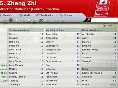 由于身在英冠,fm2008对于郑智的评估不会太高,但是从各项数值上看,郑智的确可以去担当球场上的任何位置,其全面性甚至高出了曼城队的万金油孙继海。在精神数值方面,郑智的所有数据都在10以上,这说明郑智的心理素质是非常过硬的,侵略性(15)和工作投入(15)都不错,较强的无球跑能力验证了郑智在影子前锋位置上的适应性,另外同样数值为15的决心和影响力证明了他是一名不错的队长人选。虽然在技能数值上不太突出,但心理素质的强悍也许正是帕杜到了关键时刻最期待的。