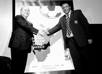 国际足联主席布拉特(左)与南非世界杯赛组委会主席科扎(右)为南非世界杯赛海报揭幕