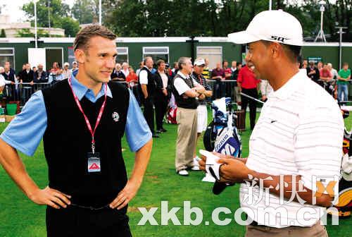 和老虎最要好的足球明星当属舍甫琴科。去年9月,在联赛开始之前,刚刚加盟切尔西的舍甫琴科到文特沃斯高尔夫俱乐部去过把球瘾,在那里他遇上了正参加一个职业和业余球员混合赛作为热身的老虎伍兹。当时老虎在汇丰世界比洞赛被提前淘汰,正到此散心。两人相谈甚欢之余,舍瓦邀请伍兹周末前往斯坦福桥观蓝军与利物浦的大战,不过那一场比赛舍瓦没有找到射门靴,他在英超很少找到“一杆进洞”的感觉。但这并不妨碍伍兹被足球比赛吸引。今年年初参加迪拜精英赛时,老虎谈完他在沙漠里设计的第一个球场后,还兴致勃勃地和众人聊起即将加盟洛杉矶银河队的贝克汉姆,他对小贝即将登陆美国表示了欢迎,尤其是前英格兰队长要去的还是他的家乡。