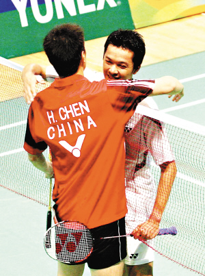 陶菲克与陈宏的较量被安排在下午2时30分进行,这场比赛本来是今天最大的看点,没想到仅耗时23分钟就结束了。陈宏曾经在2006年的世锦赛上淘汰陶菲克,之后二人交锋3次,均为陶菲克获胜。陈宏今天明显不在状态,多次出现回球下网的低级失误,而他的扣杀也没有往日的狠劲,几乎是草草了事。结果,陈宏很快便以11比21和13比21败下阵来,体力一般出了名的陶菲克在赛后连气也不喘,仅微微出汗。轻松晋级让陶菲克心情大好,“陈宏今天确实打得不怎么样,这不是他平时的水平,而我自己呢,一般吧。你们也觉得我赢得很轻松,对吧?”陶菲克甚至反问身边的记者。