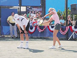 由于表演赛是在泥地上进行,因此罗迪克和麦卡锡的重炮组合显然占不到什么优势,加上37岁的荷兰老将体力有限,因此莎拉波娃和布雷克占据了上风,或许正因为如此,玩到兴头上的罗迪克在比赛进行到一半时曾跑到莎拉波娃的场地要求和俄罗斯美少女配对,但莎拉波娃似乎还在为他先前不和自己搭档而“生气”,并用球拍打砸了一下罗迪克的屁股。