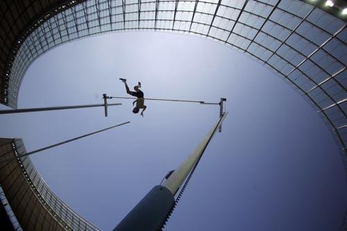 9月16日,国际田联黄金联赛最后一站--德国柏林站,本土选手罗宾格在撑杆跳的比赛中。举世闻名的圆弧形的体育场上空,罗宾格越过蓝天。