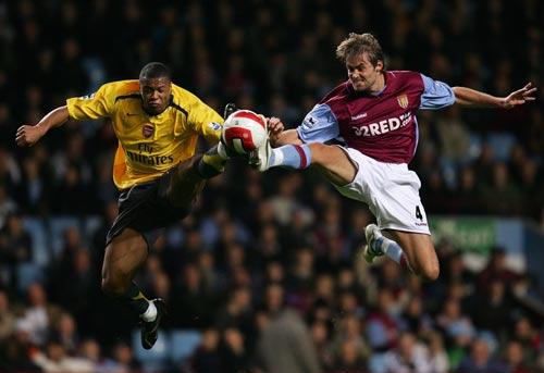 3月15日,2006-2007赛季英超联赛第28轮补赛,阿斯顿维拉0:1负阿森纳。图为阿森纳队巴普蒂斯塔与阿斯顿维拉队梅尔贝里在比赛中拼抢。真正的对决。