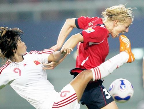 9月23日,2007年女足世界杯1/4决赛,中国0:1负挪威无缘四强。图为中国女足队员韩端(左)与挪威女足队员弗尔斯塔德拼抢。