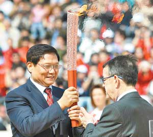 | 刘淇从希腊奥委会主席基里亚库手中接过圣火 |