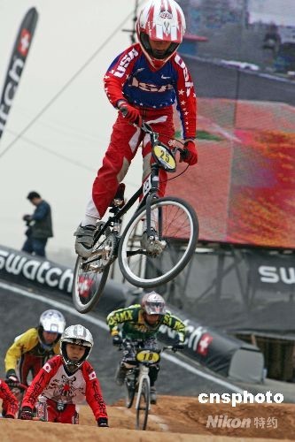 5月29日,2008国际自行车联盟小轮车(BMX)世界锦标赛(简称BMX世锦赛)在太原的拉开大幕。外国小运动员的精湛骑艺受到人们的喝彩。中新社发 张云 摄
