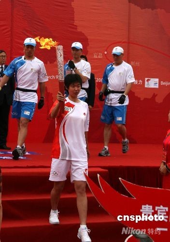 6月1日,北京奥运火炬在湖北宜昌传递。2004年雅典奥运会女子网球双打冠军李婷起跑第一棒火炬。中新社发 周兆军 摄