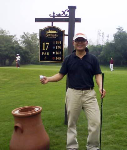 已经打了四年球的胡云耿先生站在发球台上,很轻松地挥出一杆,球以完美的弹道,越过这个佘山著名的魔鬼矿坑上空,直奔果岭而去。“球落地,往前滚动。在我低头拾起Tee时,只听后边众人喊到‘进洞了’。”胡云耿先生回忆说,“我并不相信,因为以前也有这样的情形,球在果岭上不见了,结果往往在果岭外的沙坑或长草中找到。我们径直往果岭走去,几个球友说说笑笑,我也直奔果岭后方的沙坑找球,没有找到,又在果岭和沙坑间的长草中寻觅,还是没有。这时我的心跳开始加快,回头往旗杆走去,我的球静静地躺在17号洞中。”和他一起见证一杆进洞的是他的朋友GE亚太区首席律师程伟宾先生和庄臣集团投资总监毛先生。
