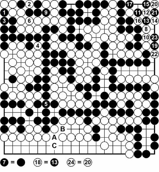 图三,白8寻劫时,黑9消劫,将一大把白子从棋盘上提取。白10粘,黑11打吃,白12搭,黑13挖,白14打吃,黑15不能在16位粘,否则白棋一气叫杀。实战双方再次成劫,白24提劫后,需要连走三手提掉右上角黑棋大块,而黑棋得以连抢A、B、C三点。