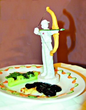 为运动员设计的菜品,我们不仅考虑到食品安全、营养搭配,而且注重饮食文化的传达。比如奥运创新菜“射箭笋尖”。这道菜用芋头雕刻成射箭形态的人物,南瓜雕刻成弓箭,青笋雕刻成箭架,最后将芦笋及香菇放入调料扒制而成。要是一名射箭运动员来全聚德用餐,得到的不仅仅是营养丰富的美食、还能感受到全聚德人的奥运情结。
